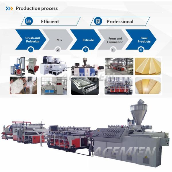 WPC PVC Wood Plastic Foam Plate Furniture Board Kitchen Cabinet Board Making Machine components: 1. Extruder system: TSK-130 flat double extruder is adopted. The screw design conforms to the process characteristics, the extrusion amount is large, the material is evenly sheared, and the extrusion efficiency is high. 2. Mold system: The special flow channel structure of the crust foaming board is adopted to make the material extrusion and foaming uniform. 3. Cooling and setting system: It adopts pressure plate type structure and hydraulic system control, which makes the plate size precision control easy. The piping designed by the cooling system allows the sheet to be cooled more evenly and quickly set. 4. Traction and cutting system: The roller type combined traction machine is used to make the traction force measurement and adjustment simple, and the roller traction machine and the wide-width cutting machine are electrically synchronized to control the plate incision straight. The entire production line has a beautiful appearance and is easy to operate electrically. The produced sheet has high foaming magnification, high surface hardness and smooth surface wear resistance.