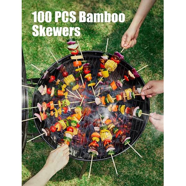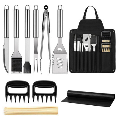 Derails in the Set | 1 x Spatula, 1 x Tongs, 1 x Silicone Basting Brush, 1 x Knife, 1 x Fork, 1 x Grill Cleaning Brush 100pcs Bamboo Skewers, 2 x Meat Claws, 1 x Grill Mat, 1 x Storage Apron |