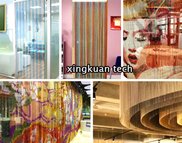 Chain fly screen is very flexible and rollable in length, has been widely used in architecture, fencing, morden design bags or cloth. Such as curtains, space dividers, wall cladding, stage background, ceiling decoration, public architectonic art in shopping mall, Restaurant, hall, Commercial office, Hotel,Bar, Resting room, Exhibition and etc.