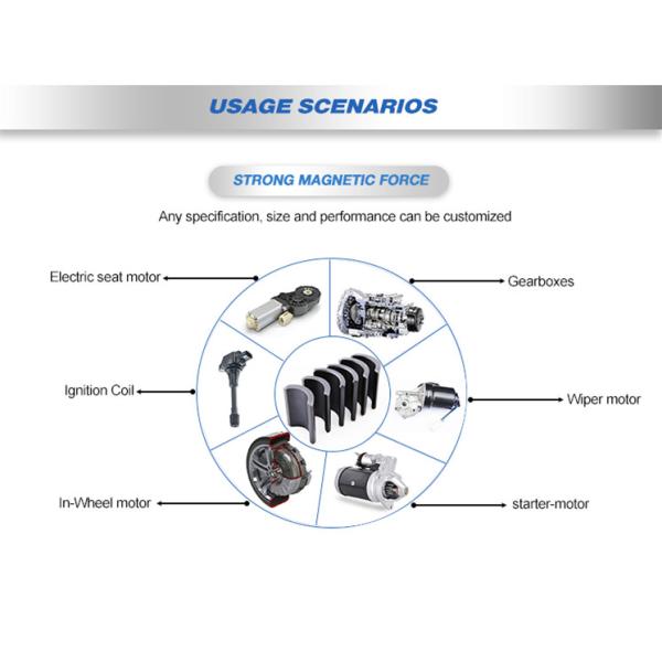 The NdFeB magnetic powder and the binder are mixed according to a certain ratio, granulated and then pressed in a mold.The product has the following characteristics:1) The product has high dimensional accuracy: it can meet the accuracy requirements in one molding, and generally does not require mechanical processing2) Free formation of product shape: it can be made into rings, cylinders, discs, tiles, blocks and various-shaped magnets.3) Excellent magnetic performance: The BH(max) is three times that of anisotropic ferrite. With high intrinsic coercivity, the product features simple production, short process, stable performance in batch production,4) Flexible magnetization methods: the magnetization can be axial, radial, spokewise and skew magnetization etc5) Good corrosion resistance and outstanding surface quality: The surface of the product is coated with epoxy resin that features excellent corrosion resistance.
