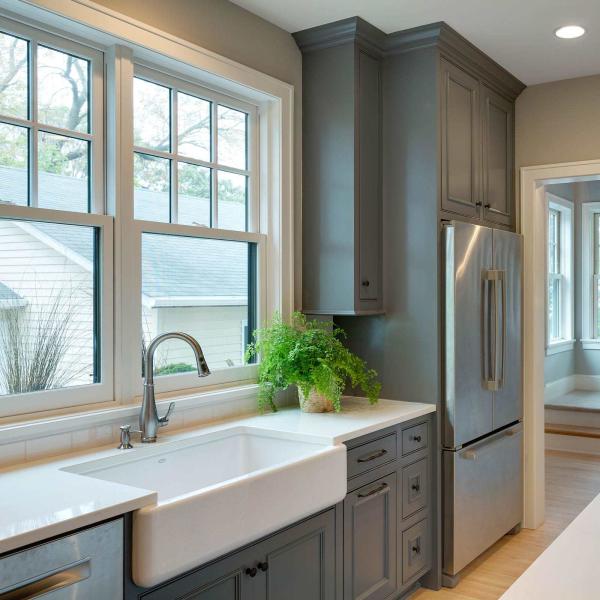 | Cabinet type: | Shaker style white base unit & wall unit with black wood grain island |