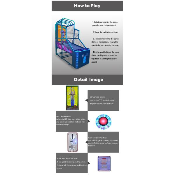 Backboard and Hoop: The machine often features a backboard and a hoop that resemble components of an authentic basketball court. The hoop may feature height modifications to accommodate players of different heights.