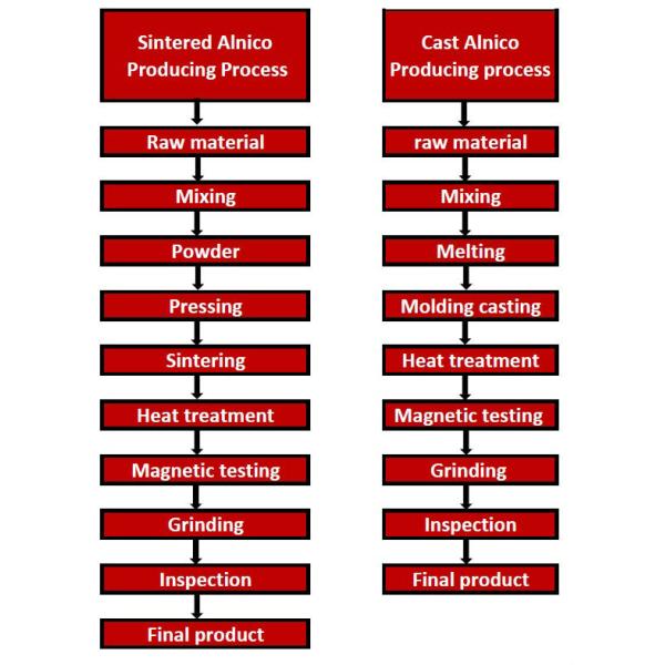 Alnico magnets are produced by sintering or casting using a mixture of aluminum,