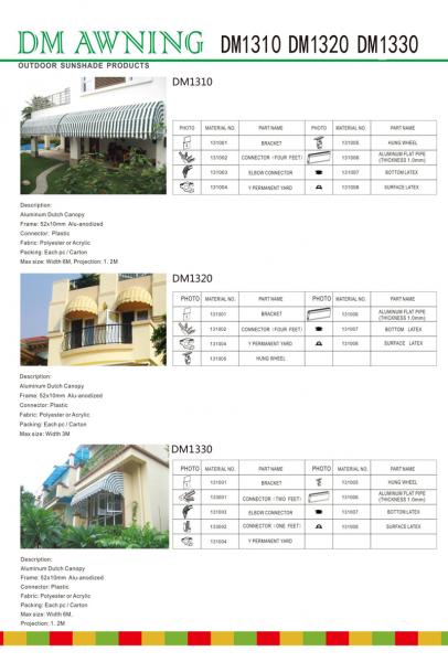 DM310,320, 330Dutch windowAwning suitable forhouse, shop,garden, villa, terrace, beach, entertainment ares and etc. Mainly for sunshading and decoration.