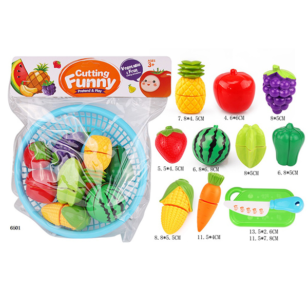 Each kit contains 9 pieces of cutable fruits and vegetables plus a chopping board, a beautiful knife and a nice pink or blue basket, which is perfect for both boys and girls.