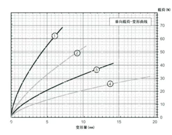 | Curve number | Model | Maximum static load(N) | Maximum deformation(mm) | Vibration stiffness KN/m) | Impact stiffness(KN/m) |